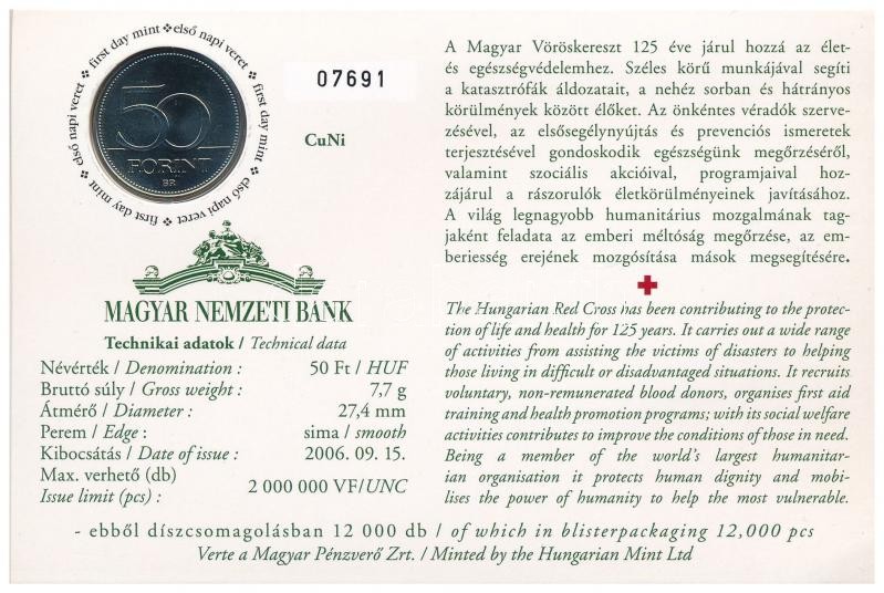 Leírás: 2006. 50Ft "125 éves a Magyar Vöröskereszt" első napi veret sorszámozott emléklapon "07691" T:1