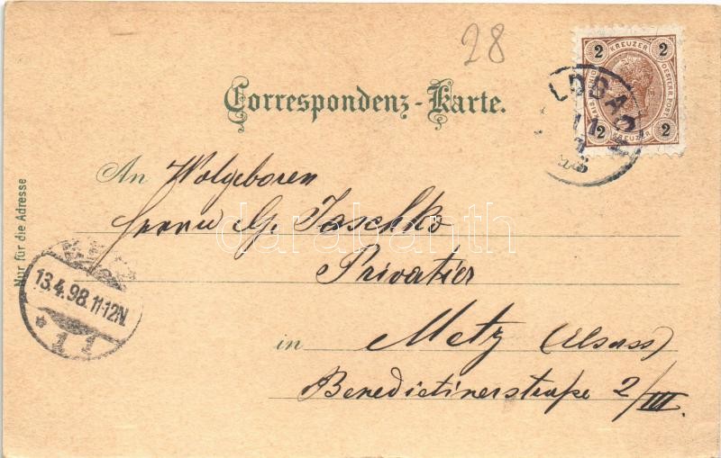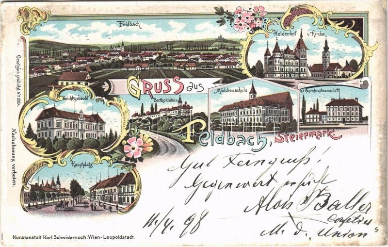 1898 Feldbach (Steiermark), Bertholdstein, Holdenhof u. Kirche, Mädchenschule, Gerichtsgebäude, Hauptplatz, K.K. Bezirkshauptmannschaft / castle, church, girls' school, district commission, main square. Kunstanstalt Karl Schwidernoch No. 2024. Art Nouveau, floral, litho (EK)