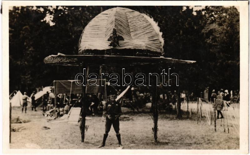 1933 Gödöllő, Cserkész Világ Jamboree, vesszőkből épített cserkész kalap / World Scout Jamboree, scout hat built of twigs at the camp. photo (ragasztónyom / gluemark)