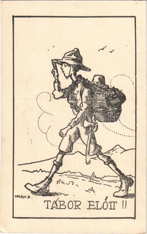 Leírás: Tábor előtt! A KEG (Katolikus Egyetemi Gimnázium) cserkészcsapatok kiadása / Hungarian boy scout art postcard, at the scout camp s: Velősy Béla (EK)