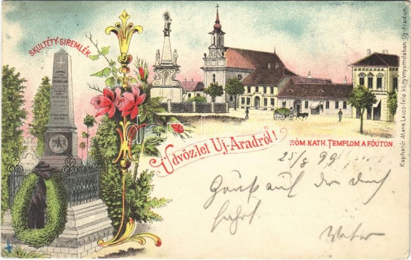 1899 Arad, Újarad, Aradul Nou; Skultéty síremlék, Római katolikus templom a főúton. Mayer Lajos kiadása / tombstone, Catholic church, street view. Art Nouveau, floral, litho (EK)