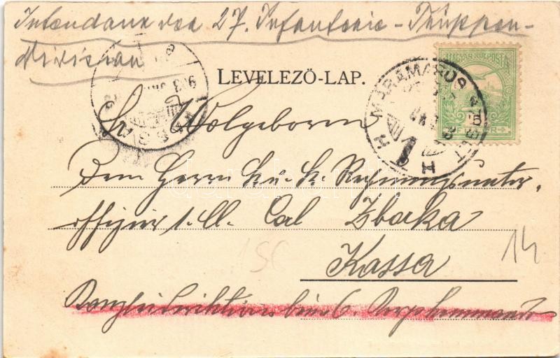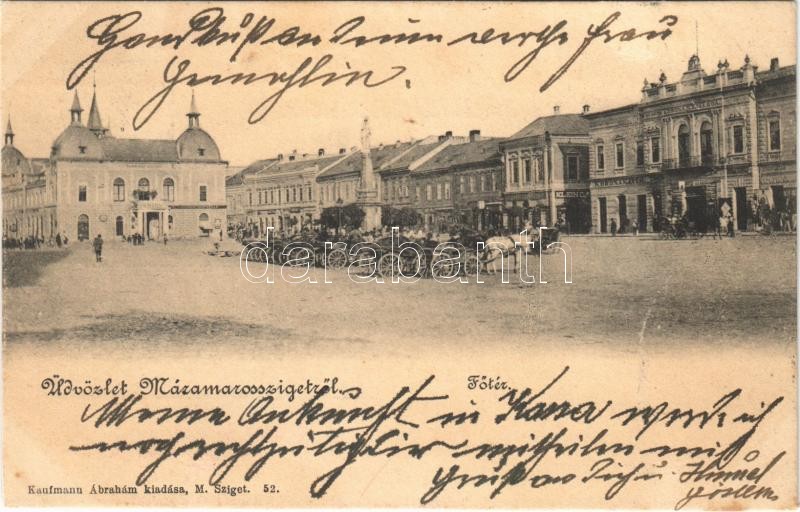 1903 Máramarossziget, Sighetu Marmatiei; Fő tér, Korona szálloda és kávéház, Klein D. üzlete, piac. Kaufmann Ábrahám kiadása / main square, hotel, café, shops, market vendors (gyűrődés / crease)