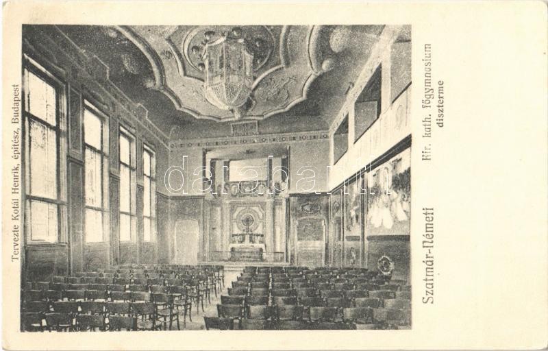 1915 Szatmárnémeti, Szatmár, Satu Mare; Kir. katolikus főgimnázium díszterme, belső. Tervezte Kotál Henrik építész. Reizer János kiadása / Catholic high school, interior (EK)
