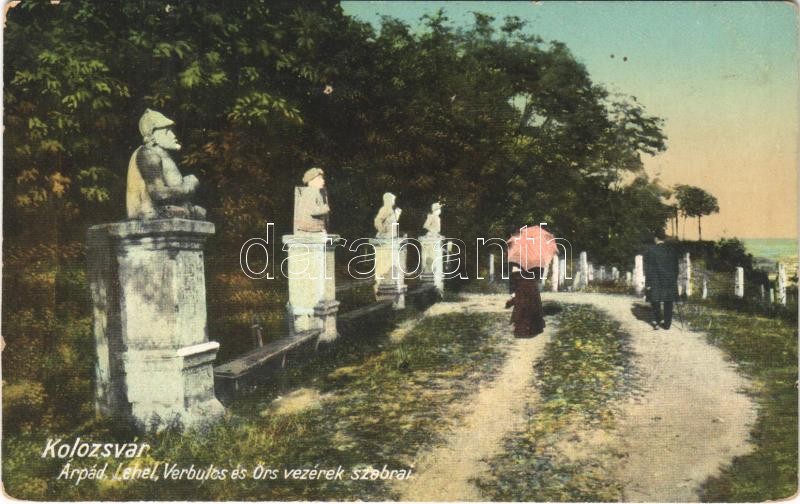 Leírás: Kolozsvár, Cluj; Árpád, Lehel, Verbulcs és Örs vezérek szobrai / statues
