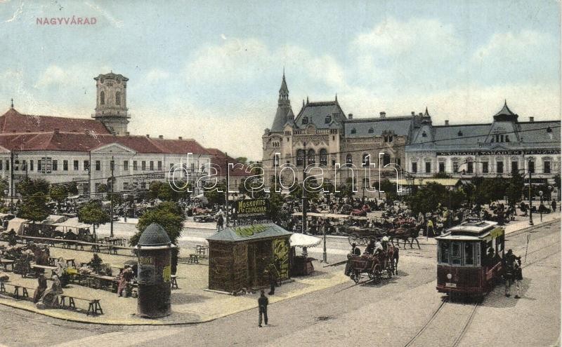 Leírás: Nagyvárad, Oradea; Moskovits Cipőgyár, Balogh Gyula, Kohn üzletei, Takarékpénztár, villamos, piac, Bettelheim Miksa és Társa kiadása / shops, savings bank, tram, market square (Rb)