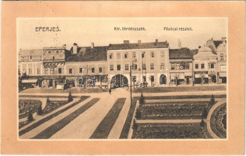 1911 Eperjes, Presov; Fő utca, Kir. Törvényszék, Cattarino Sándor, Ambrózy Béla, Goldberger üzlete. Divald Károly Fia kiadása / main street, court, shops