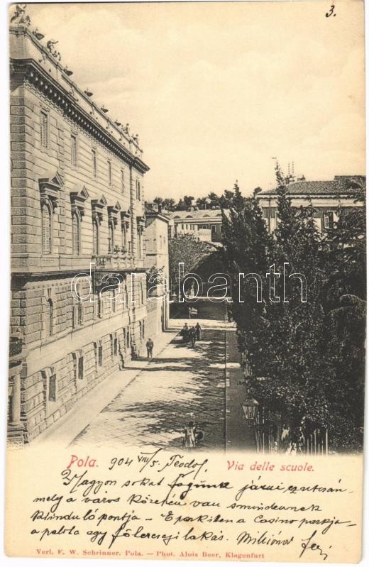 1904 Pola, Pula; Via delle scuole / street, park https://www.darabanth.com/hu/386-Gyorsarveres/386.0/Kepeslapok/Horvatorszag~1500009/1904-Pola-Pula-Via-delle-scuole-street-park~II2313036
