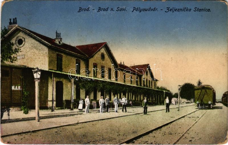 Leírás: 1918 Bród, Nagyrév, Slavonski Brod, Brod an der Save; pályaudvar, vasútállomás / Zeljeznicka Stanica / railway station (kopott sarkak / worn corners)