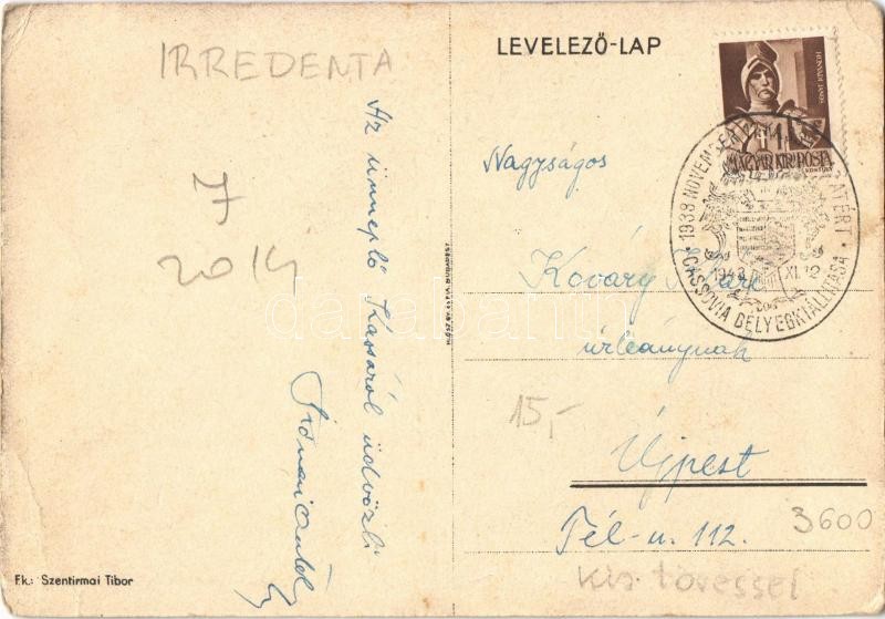 1938 November 11. Kassa hazatért! Magyar címeres irredenta / Kosice, Hungarian irredenta art postcard with coat of arms + "1943 Cassowai Bélyegkiállítás" So. Stpl (EK)