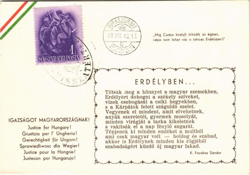 Igazságot Magyarországnak! Míg Csaba királyfi őrködik az égben, népe nem lehet rab a bérces Erdélyben! / Justice for Hungary! Hungarian irredenta propaganda with Hungarian flag decoration + "1938 Rimaszombat visszatért" So. Stpl.