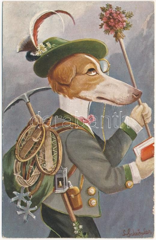 Leírás: Barsoi als Bergfex. Humoristische Hunde / A Barsoi as a Mountain Climber. Humorous Dogs Serie 2047/6. s: Schröpler (ázott / wet damage)