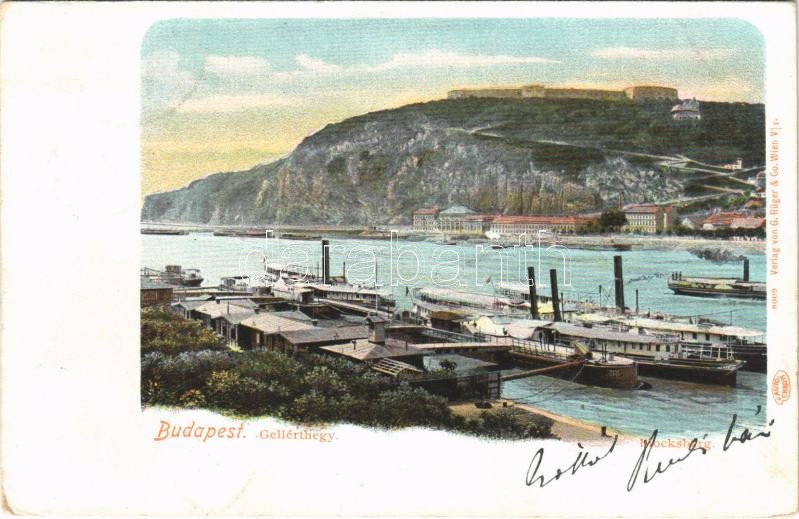 1902 Budapest XI. Gellérthegy, pesti kikötő, gőzhajók, citadella https://www.darabanth.com/hu/386-Gyorsarveres/386.0/Kepeslapok/Magyarorszag~1500005/1902-Budapest-XI-Gellerthegy-pesti-kikoto-gozhajok-citadella~II2294337