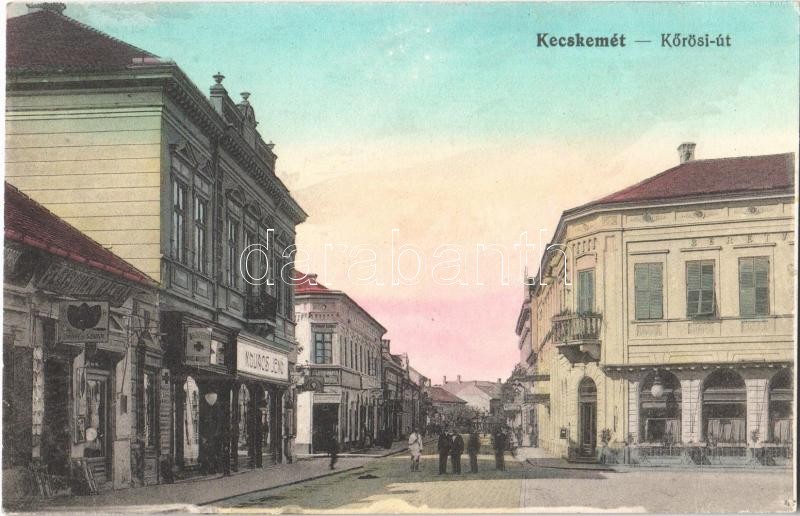 Leírás: Kecskemét, Kőrösi út, Fleischer Kálmán, Király Károly, Kovács Jenő üzlete, Vöröskereszt drogéria (gyógyszertár)