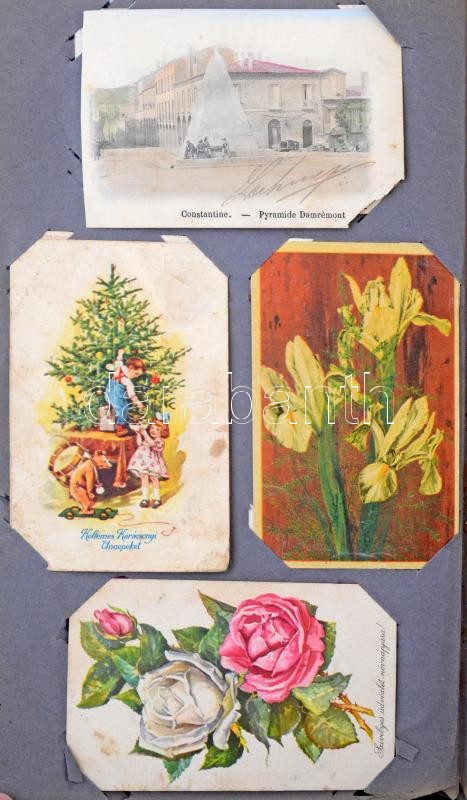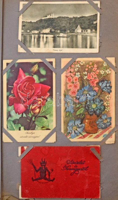 Ódon képeslapalbum régi és modern képeslapokkal: városok és motívumok/ Old and damaged postcard album with pre-1945 and modern postcards: town-views and motives