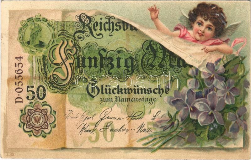 Leírás: 1909 Fünfzig Mark. Glückwünsche zum Namenstage / Name Day greeting art postcard with German banknote. Art Nouveau, floral, litho
