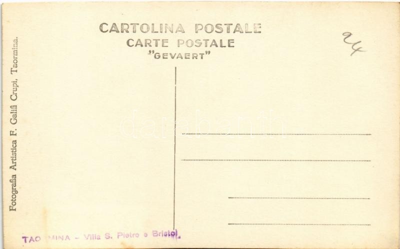 Taormina, Villa S. Pietro e Bristol / villa, hotel. Fotografia Artisti... https://www.darabanth.com/hu/386-Gyorsarveres/386.0/Kepeslapok/Olaszorszag~1500065/Taormina-Villa-S-Pietro-e-Bristol-villa-hotel-Fotografia-Artistica-F-Galifi-Crupi~II2179295