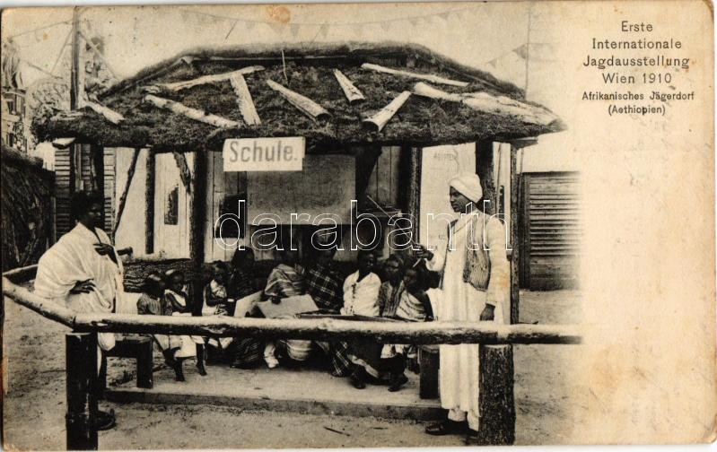 1910 Wien, Erste Internationale Jagdausstellung. Afrikanisches Jägerdorf (Aethiopien), Schule / The First International Hunting Exposition in Vienna. African (Ethiopian) hunting village's school (gluemark)