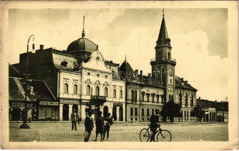 Leírás: Nagykikinda, Velika Kikinda; Fő tér, Prágai György, Schwartz és Kolta, Milivoj J. Bogdan üzlete / main square, shops (EK)