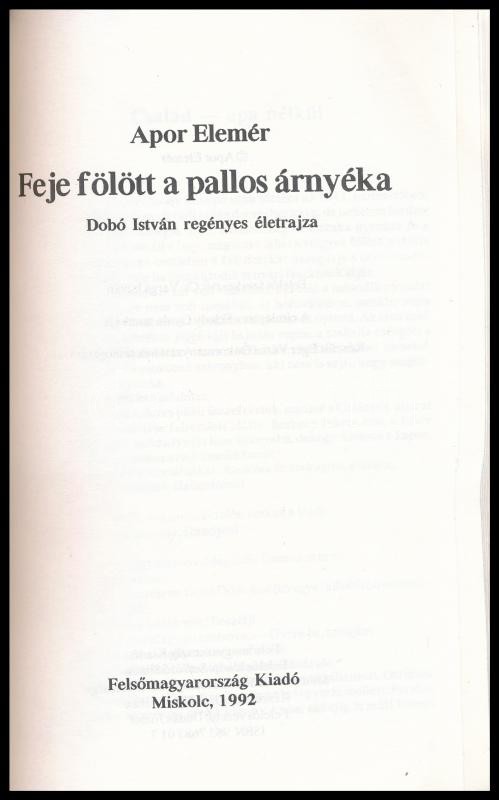Apor Elemér: Feje fölött a pallos árnyéka. Dobó István regényes életra... https://www.darabanth.com/hu/386-Gyorsarveres/386.0/Konyvek/Konyvek-Egyeb-ritkasagok~1000019/Apor-Elemer-Feje-folott-a-pallos-arnyeka-Dobo-Istvan-regenyes-eletrajza-Miskolc-1992-F~II2307039