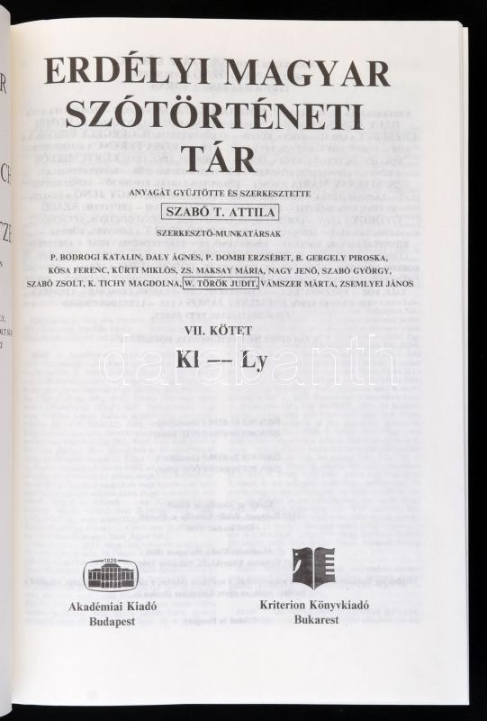 Leírás: Erdélyi Magyar Szótörténeti Tár VII. kötet. Szerk.: Szabó T. Attila. Bp.-Bukarest, 1995, Akadémiai Kiadó-Kriterion. Kiadói egészvászon-kötés.