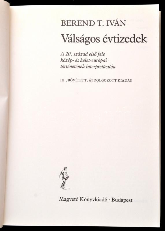 Berend T. Iván: Válságos évtizedek. A 20. század első fele a közép- és kelet-európai történetének interpretációja. Bp., , Magvető. III., bővített, átdolgozott kiadás. Bp., 1987, Magvető. Kiadói egészvászon-kötés, kiadói papír védőborítóban.