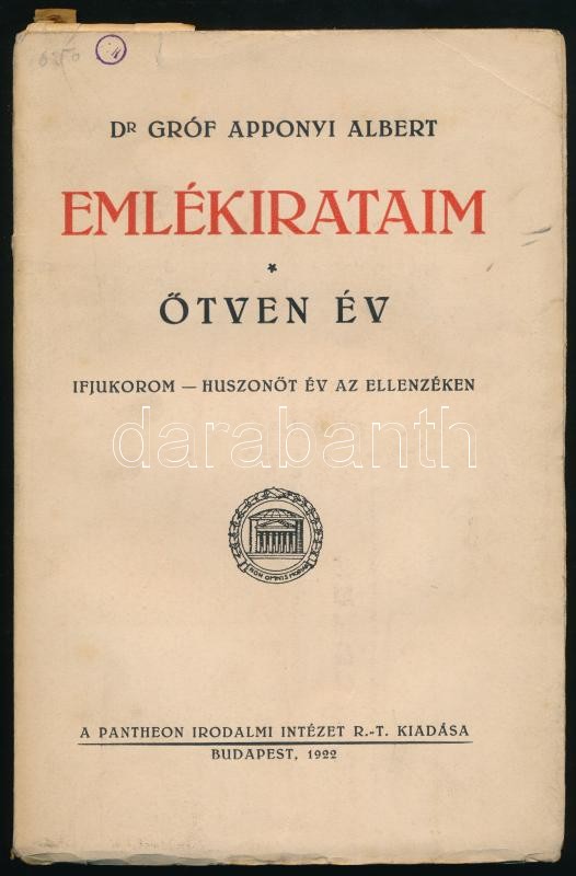 Dr. Gróf Apponyi Albert: Emlékirataim. Ötven Év. Ifjukorom - Huszonöt év az ellenzékben. Bp.,1922, Pantheon, 257+6 p. Első kiadás. Kiadói papírkötésben, ceruzás aláhúzásokkal, a gerinc kissé foltos, kissé szakadt, a borító egyik sarkán gyűrődéssel.