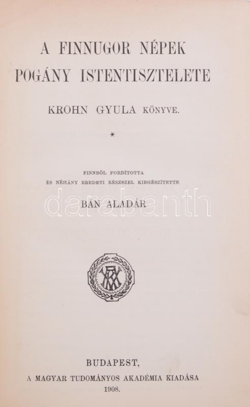 Leírás: Krohn Gyula: A finnugor népek pogány istentisztelete. Fordította: Bán Aladár. Bp., 1908, MTA. Kiadói egészvászon kötés, festett lapszélek, kissé kopottas állapotban.