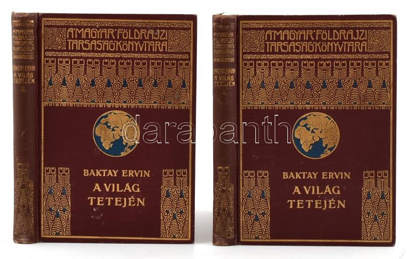 Baktay Ervin: A világ tetején I-II. kötet. Kőrösi Csoma Sándor nyomdokain Nyugati Tibetbe. Magyar Földrajzi Társaság Könyvtára. Bp., é. n.[cca 1930 után], Lampel R. (Wodianer F. és Fiai), 1 (címkép) t. +1-144 p.+17 (fekete-fehér fotók) t.+145-312 p.+13 t.(fekete-fehér fotók.)+2 t. (térképek.) Harmadik kiadás. Kiadói dúsan aranyozott egészvászon sorozatkötésben, egy lap kijár