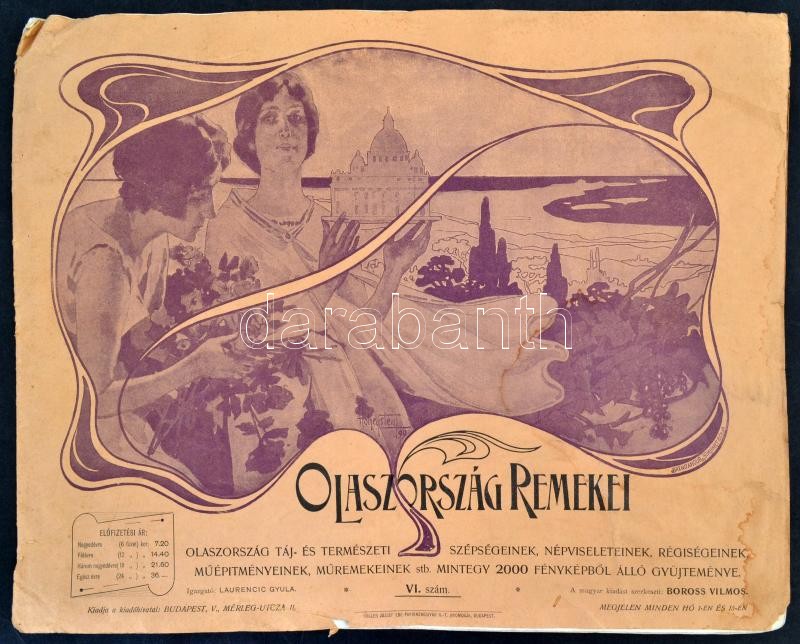 Leírás: Olaszország remekei VI. évf. Szerk: Boross Vilmos. Bp., én., Rigler József Ede-ny., 81-95+1 p. Fekete-fehér fotókkal. Kiadói papírkötés, gyűrődéssel, szakadt, foltos borítóval.