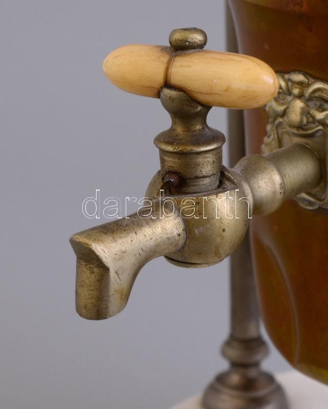 Leírás: Régi különleges kávéfőző, porcelán talppal, réz testtel, üveg fedővel, az üveg fedőn lyukkal, a réz testen horpadással, m: 24 cm