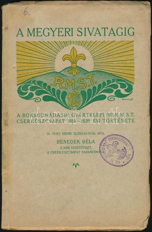 Benedek Béla A megyeri sivatagig. A borsodnádasdi gyártelepi 103. R.M.S.T. cserkészcsapat 1919-1926. évi története. Borsodnádasd, 1927. Szerző. (,,Fébé"). 95+(1) p. Fűzve, kiadói papírborítóban.