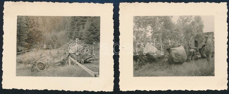 Leírás: 1941 Felborult, elakadt magyar katonai szállító járművek a Kárpátokban, 2 db fotó, hátoldalon felirattal, 7,5×6 cm