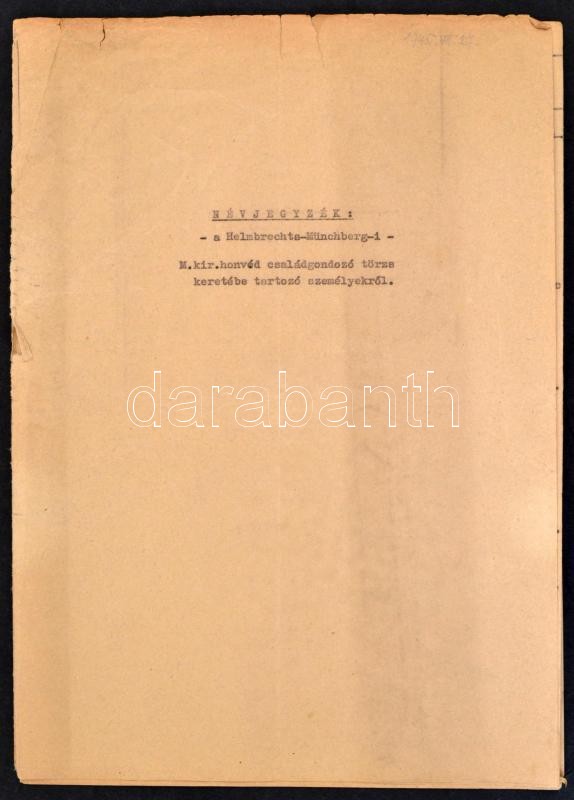 Leírás: 1945 Névjegyzék a Helmbrechts-Münchberg-i M. Kir. Honvéd családgondozó törzs keretébe tartozó személyekről, 241 névvel, 2+6 sztl.lev
