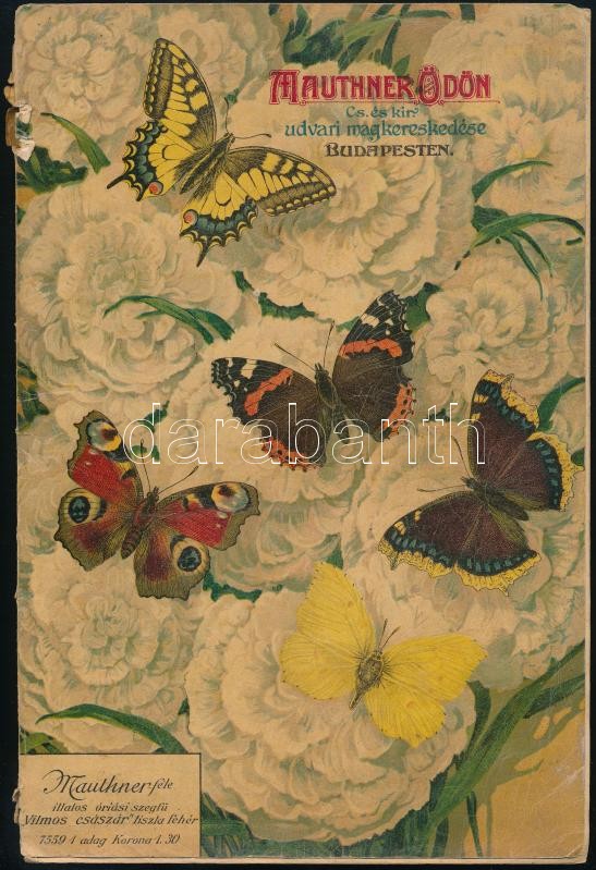 1917 Mauthner Ödön cs. és kir. magkereskedésének árjegyzéke, 1917. jan. 27., XIX évf. 1. sz., szakadt borítóval, a borító részben elvált a könyvtesttől, 156 p. Továbbá 2 db boríték hozzá ragadt megrendelő lapokkal, és 1 db további megrendelőlap.