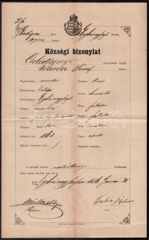 1886 Egyháznagyszeghi (Felvidék) községi bizonylat kitöltve, Weiner József izraelita vallású helyi lakos részére cselédkönyv megszerzése érdekében, aláírva, pecsételve, hajtva, de szép állapotban