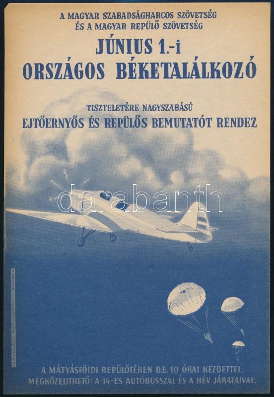 1952 Villamosplakát: A Magyar Szabadságharcos Szövetség és a Magyar Repülő Szövetség Június 1.-i Országos Béketalálkozó tiszteletére nagyszabású ejtőernyős és repülős bemutatót rendez, 23,5x16,5 cm