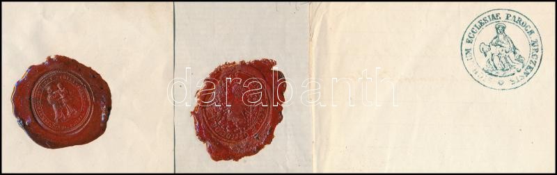 Leírás: 1864-1871 3 db latin nyelvű irat, Ófalváról, Szombathelyről, Zircről, 2 db-on viaszpecséttel, ceruzás megjegyzésekkel, foltokkal