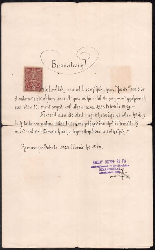 Leírás: 1923 Rimaszombat, ajánlólevél + 1942 Rimaszombat, házassági értesítő