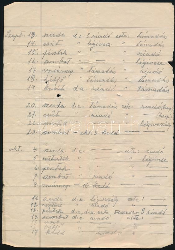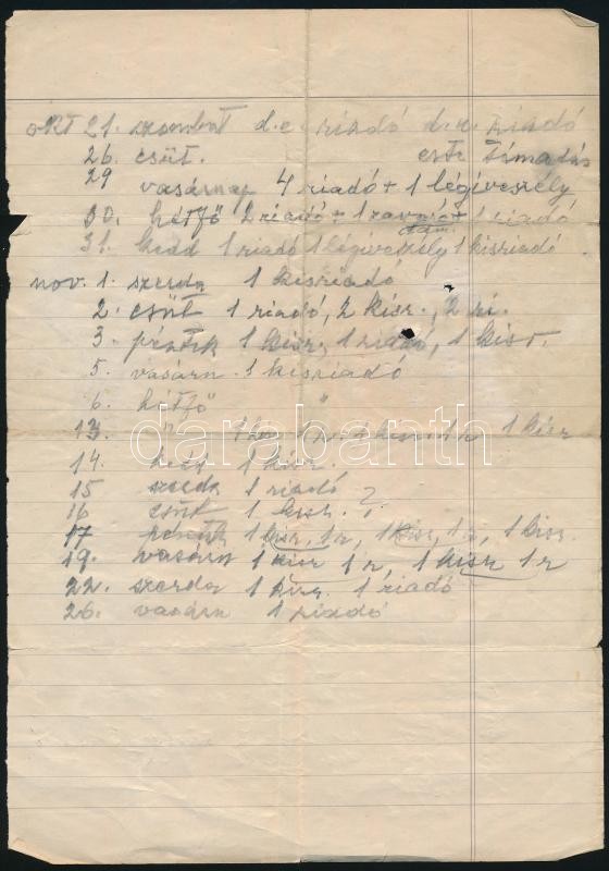 budapesti légitámadásokról és riadókról írt feljegyzés, 1 lapon, 2 oldalon, lap szélén apró sérülésekkel
