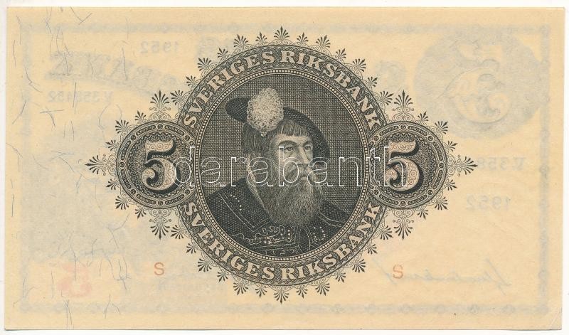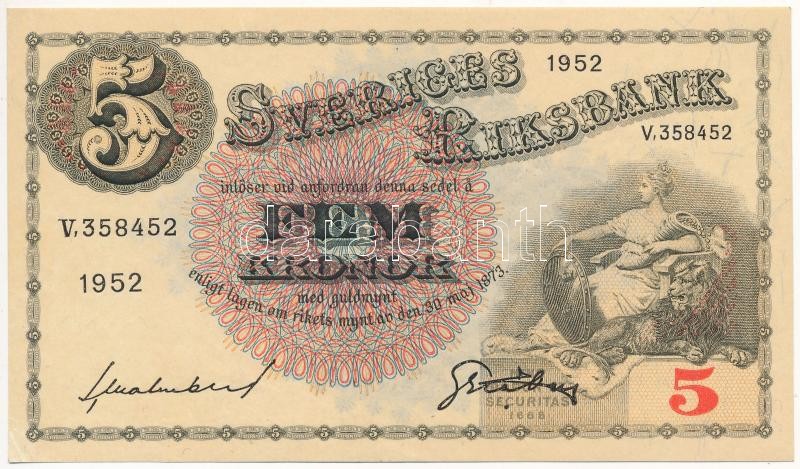 Krause P#33 https://www.darabanth.com/hu/386-Gyorsarveres/386.0/Numizmatika/Kulfoldi-bankjegyek~2000014/Svedorszag-1952-5K-TI--Sweden-1952-5-Kronor-CAU-Krause-P2333~II2313406
