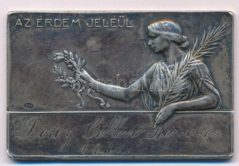 Leírás: 1931. "Az érdem jeléül - Dorog Céllövő Bajnoka" jelzett Ag díjplakett, "S.G.A. (Scheid G. A. ezüstárú és fémgyár)" jelzéssel (44,57g/57x37mm) T:2 ph.