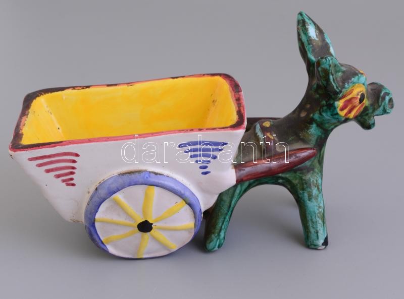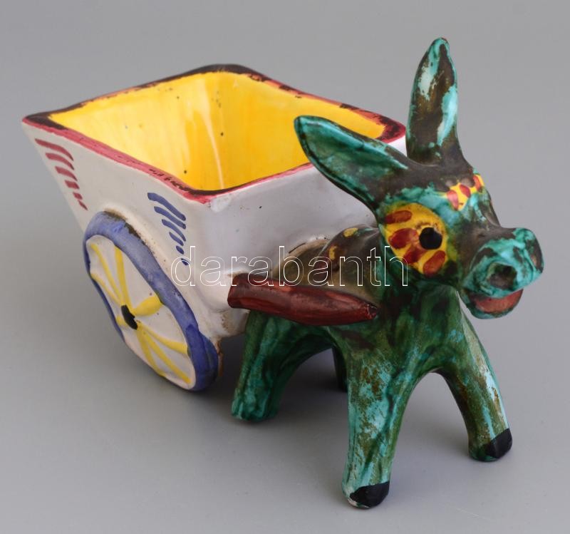 Leírás: Szamár kocsival kerámia figura, kézzel festett, jelzett, lepattanásokkal, h: 18 cm