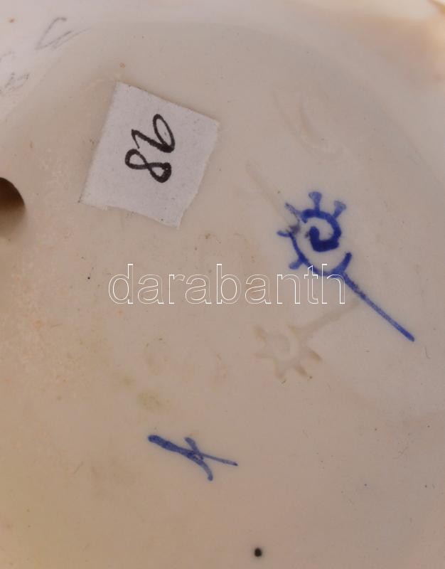 Leírás: Passaui porcelán kalapos nő, kézzel festett, jelzett, restaurált, kopásnyomokkal, m: 18 cm
