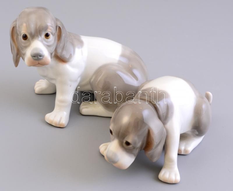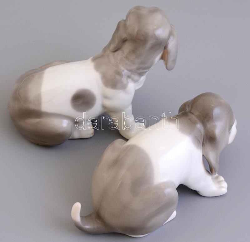 Leírás: Porcelán kutya, 2 db, kézzel festett, jelzés nélkül, kis kopásnyomokkal, h: 13 cm