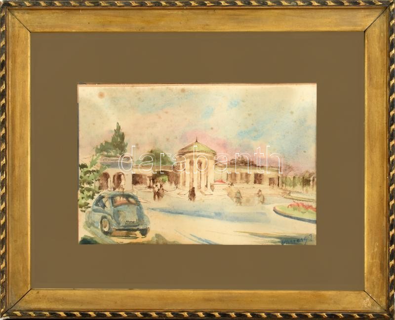 Leírás: Vaszary J. jelzéssel: Sétálók. Ceruza, akvarell, kréta, papír, foltos. Üvegezett fa keretben. 22,5x33 cm
