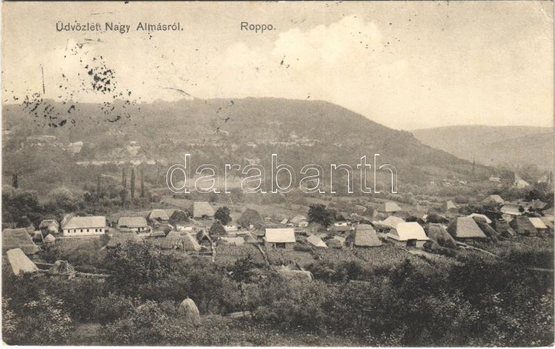 1911 Nagyalmás, Almasu Mare; Roppo. Kabát Emil kiadása / general view ... https://www.darabanth.com/hu/387-Gyorsarveres/387.0/Kepeslapok/Erdely~2000005/1911-Nagyalmas-Almasu-Mare-Roppo-Kabat-Emil-kiadasa-general-view-EK~II2320637
