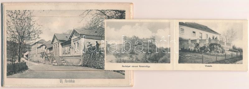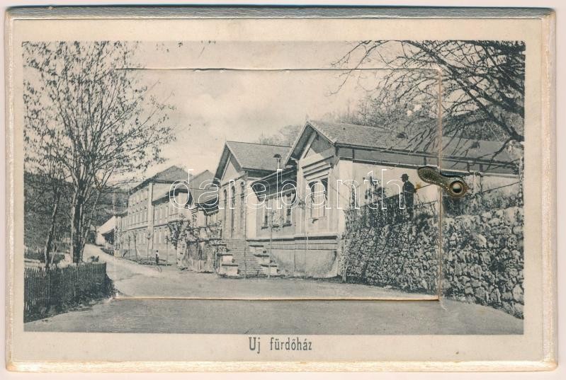 Vihnye, Vihnyefürdő, Kúpele Vyhnye; Új fürdőház. Keményhátú leporellólap belül Scholtz, Pfeilmajer, Helmbacher, Gecsányi, Szokács villa, Revistyei várrom, vízesés, Kachelmann gyártelep. Joerges A. özv. és fia kiadása / new spa. board leporellocard with villas, waterfall, factory colony inside