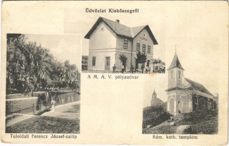 1914 Kiskőszeg, Batina (Darázs, Draz); MÁV pályaudvar, vasútállomás, Római katolikus templom, Túloldali Ferenc József zsilip. Körbel Ferenc kiadása / railway station, church, water lock