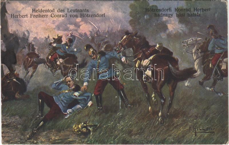 1915 Heldentod des Leutnants Herbert Freiherr Conrad von Hötzendorf / Hötzendorfi Konrád Herbert hadnagy hősi halála / WWI Austro-Hungarian K.u.K. military art postcard s: F. Höllerer (EK)