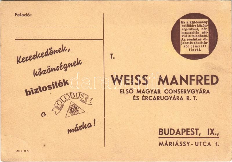 Weiss Manfred első magyar conservgyára (konzerv gyár) és ércárugyára, Globus márka, reklám. Budapest, Máriássy utca 1. / Hungarian cannery advertisement (EK)